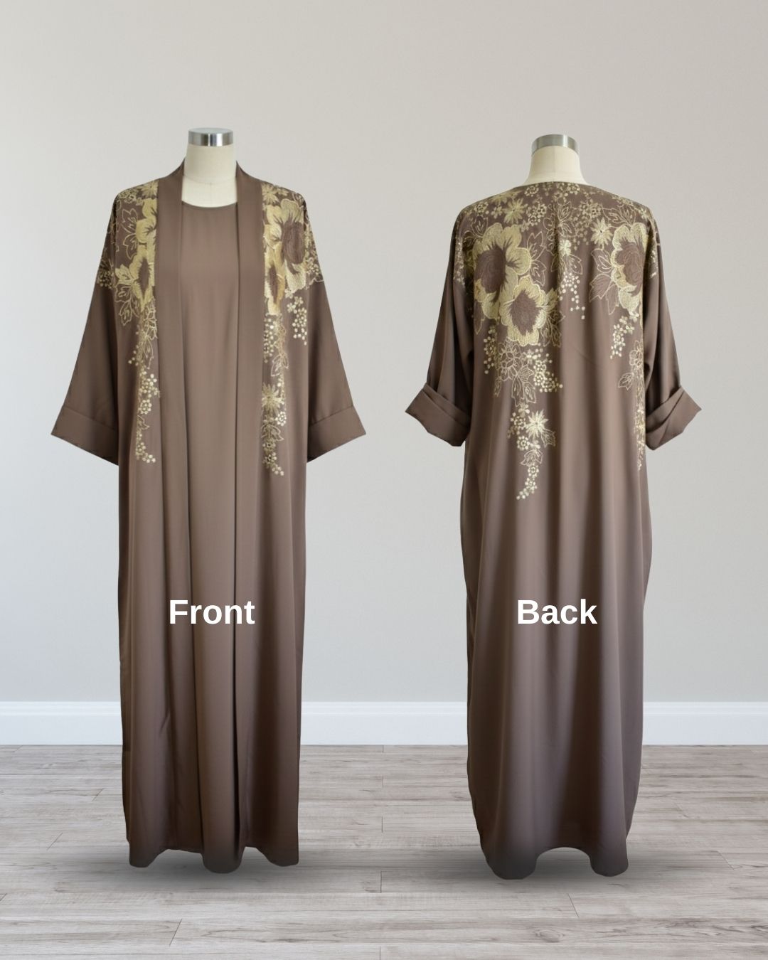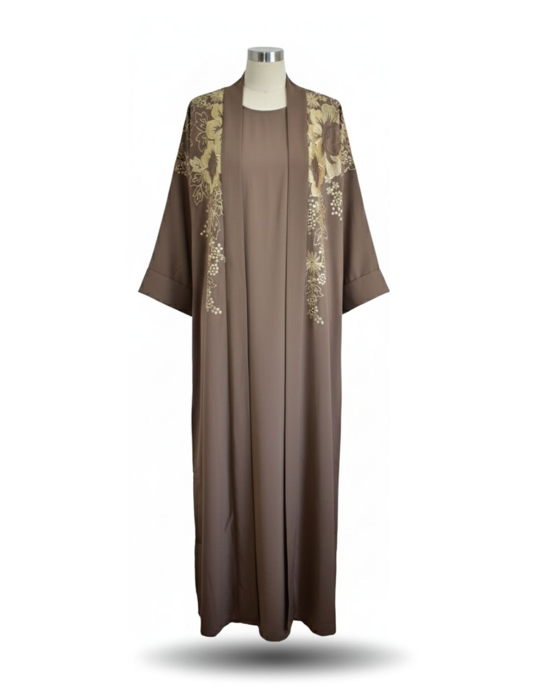 Elevate your modest collection with the richly detailed ABIM502 3pc Abaya Set. This comprehensive set in a classic Brown shade is beautifully embellished, offering a complete and elegant look for any event.