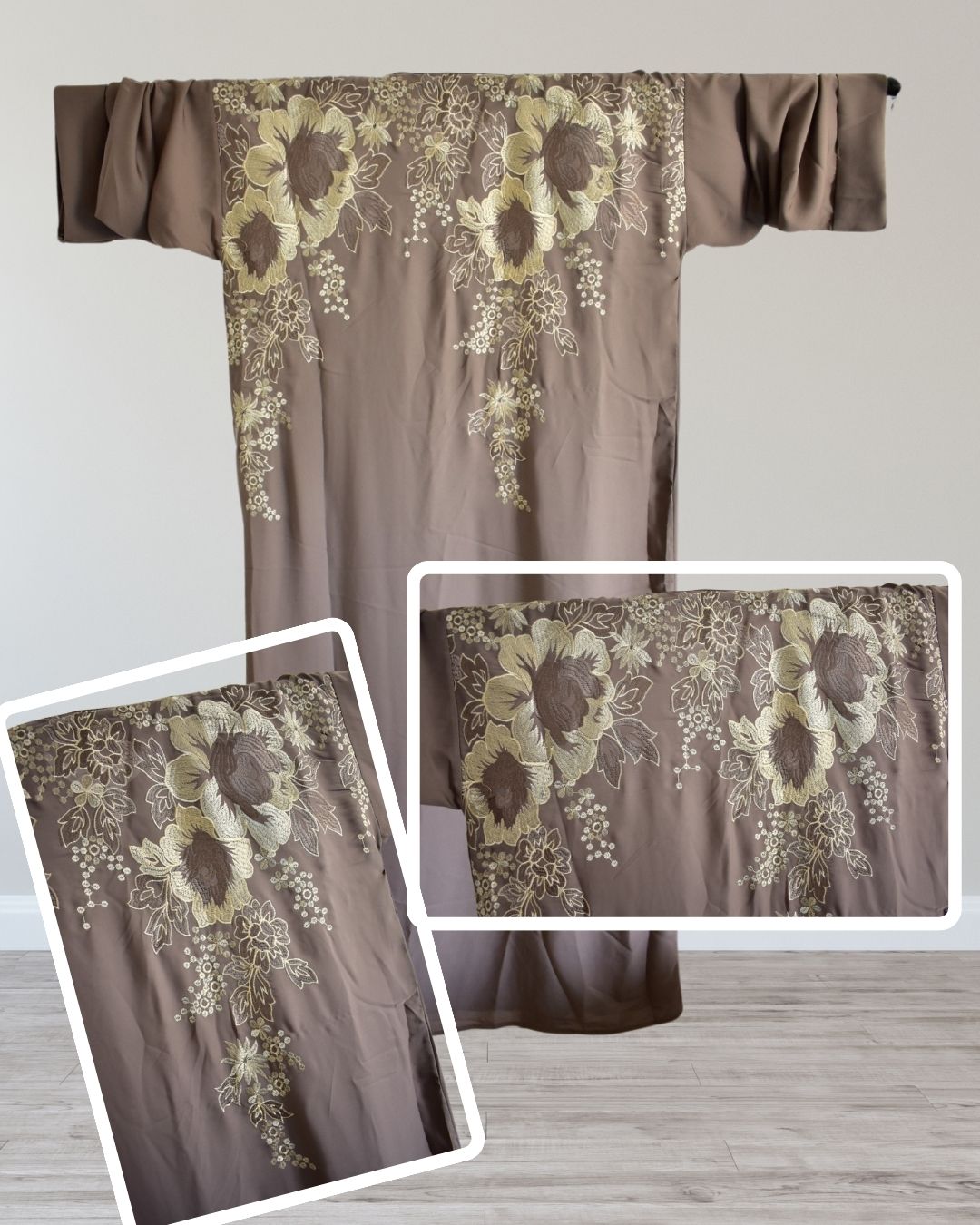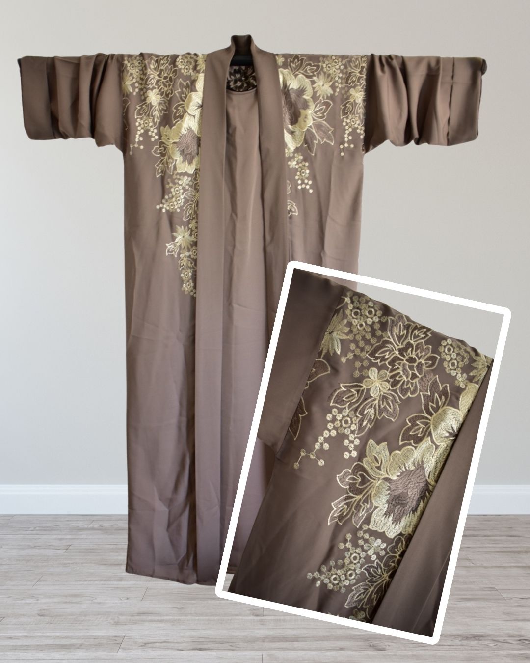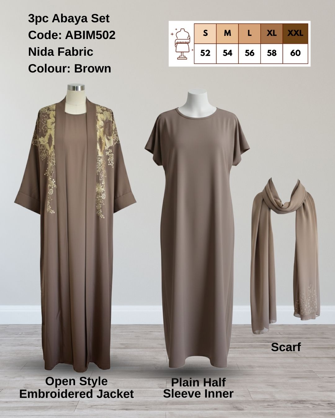 ABIM504 3pc Embroidered Abaya Set Nida Fabric Brown Open Jacket, Inner, Scarf