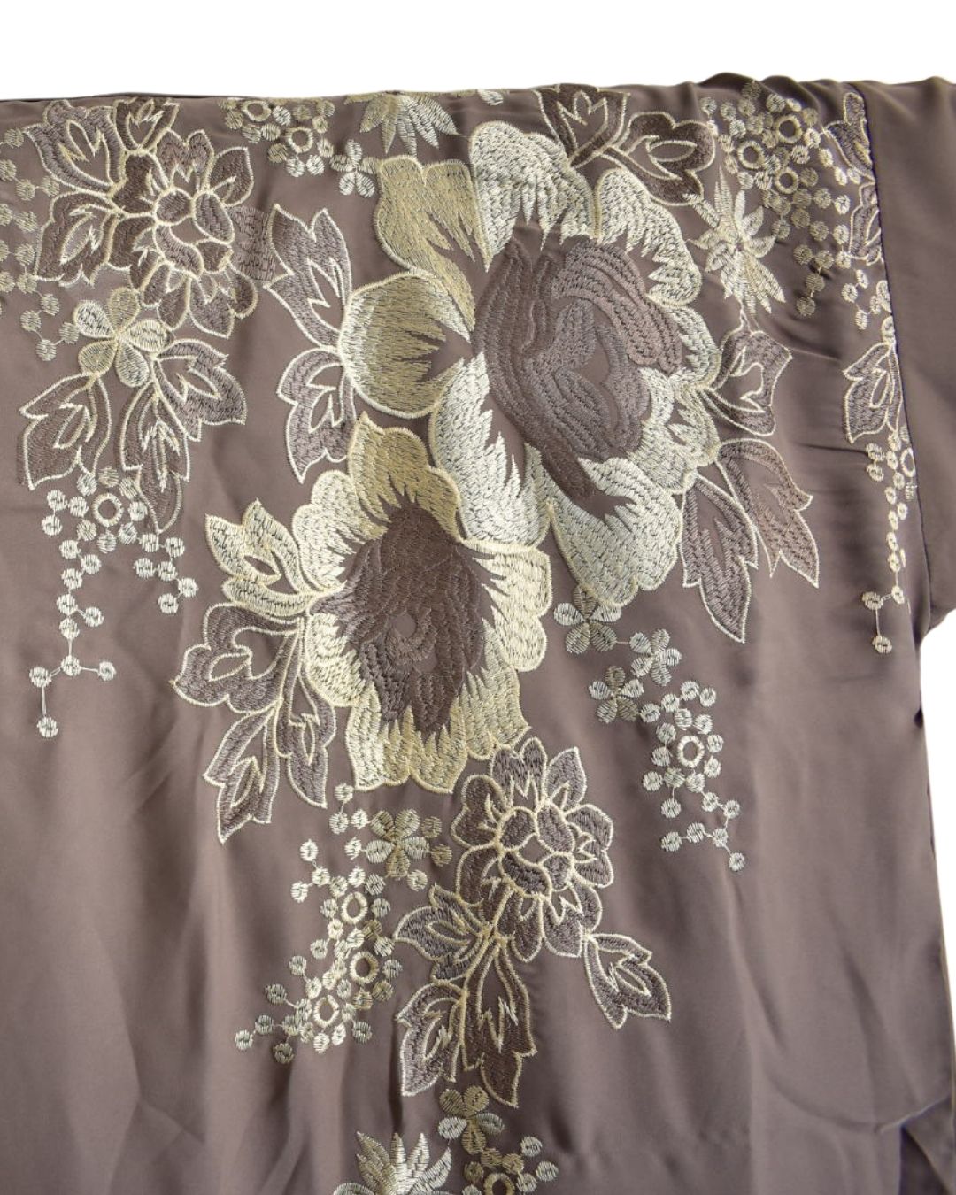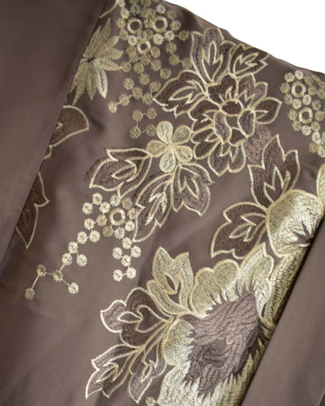 Outer Piece (Jacket): A stunning Front Open Long Sleeve Jacket in Brown. It features beautiful gold/tan floral embroidery cascading over the shoulders and down the front panels. The embroidery is prominently displayed across the entire upper back, adding a dramatic finish.