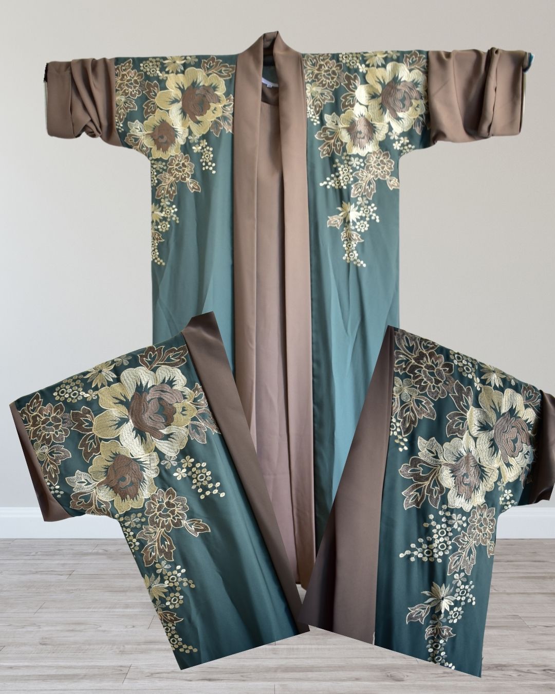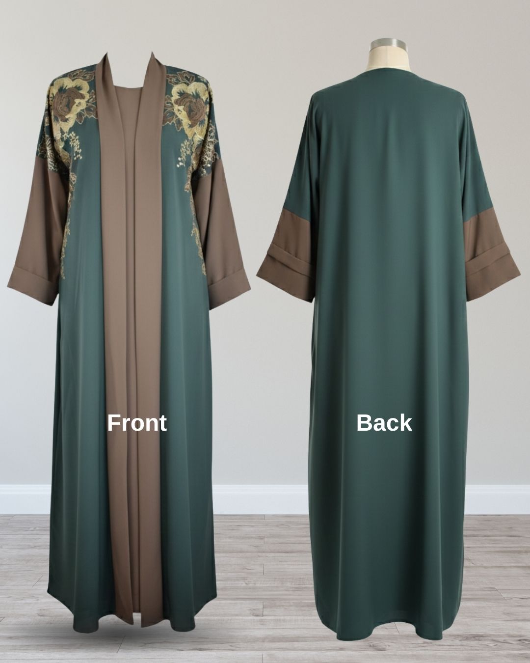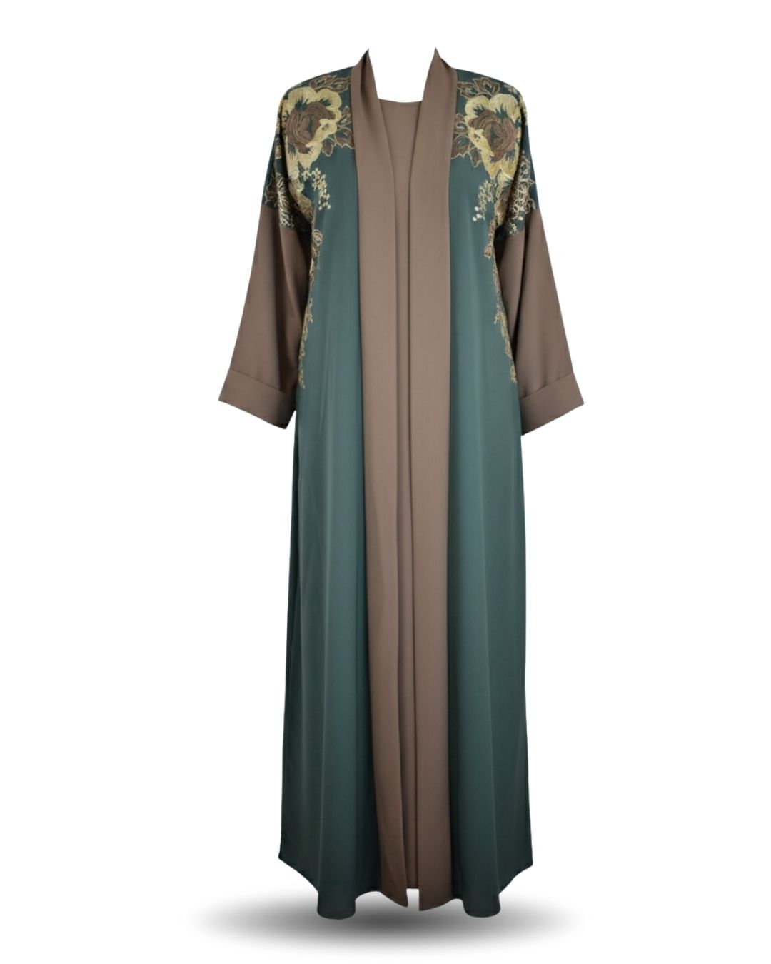 ABIM504 3pc Embroidered Contrast Abaya Set Nida Fabric Green & Brown Open Jacket, Inner, Scarf