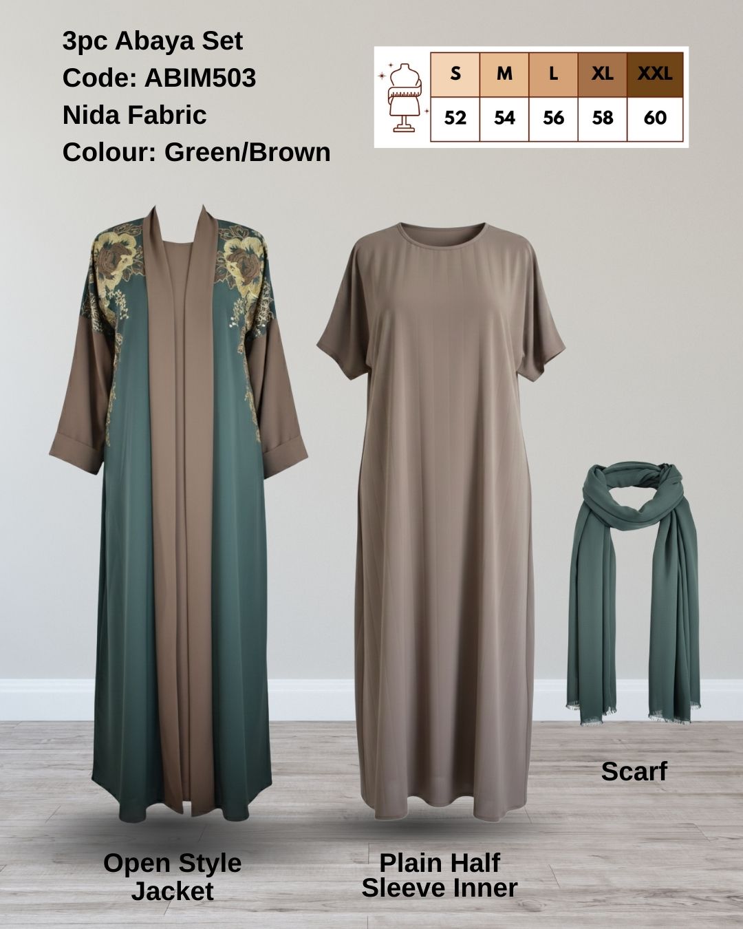 Embrace rich colour contrast with the elegant ABIM503 3pc Abaya Set. This ensemble is designed for sophistication, featuring a beautiful combination of deep Green and earthy Brown, complete with eye-catching embroidery.