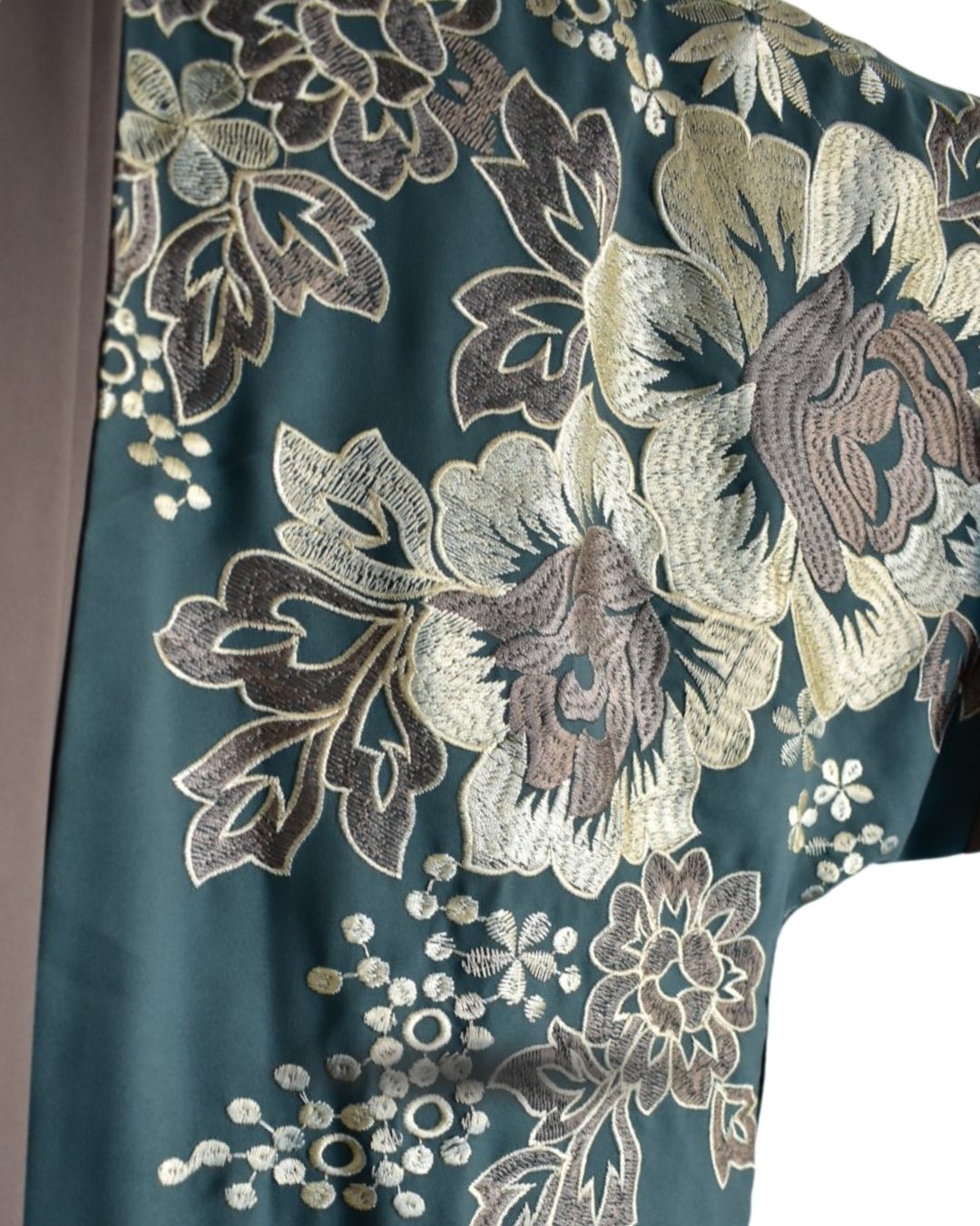 Embellishment: The jacket is adorned with rich Gold/Tan Floral Embroidery that drapes over the shoulders onto the chest panels, providing a luxurious, traditional touch.