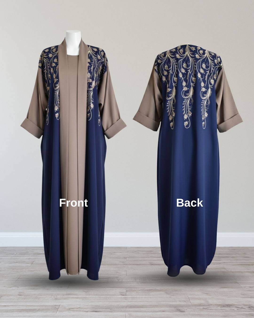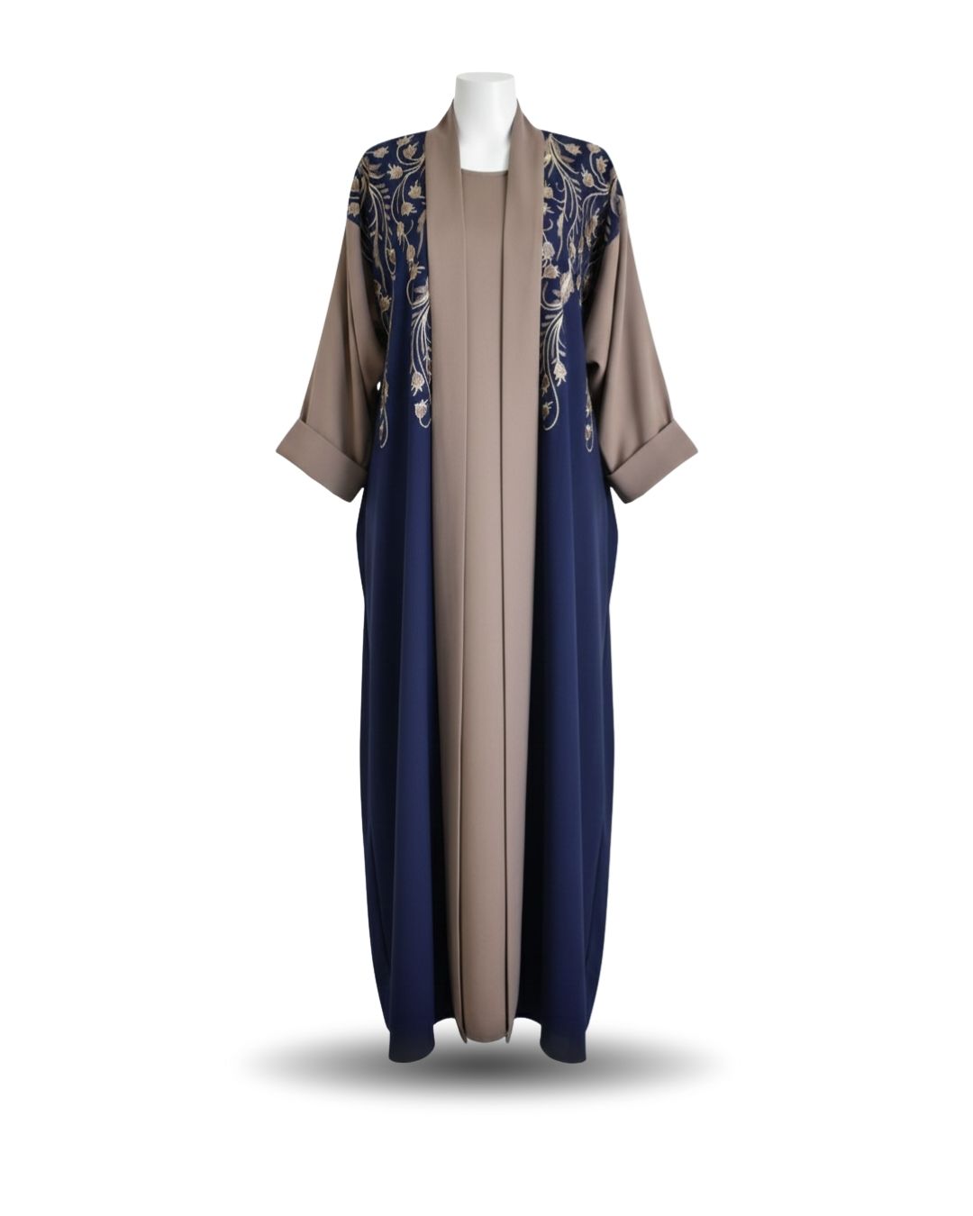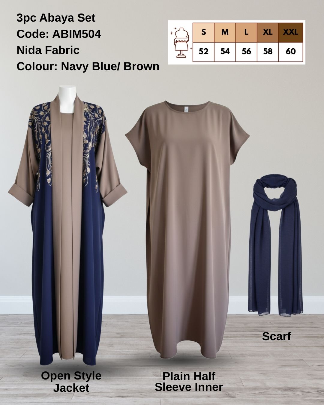 • ABIM504 3pc Embroidered Contrast Abaya Set Nida Fabric Navy Blue & Brown Open Jacket, Inner & Scarf, Dual-Tone Modest Wear
