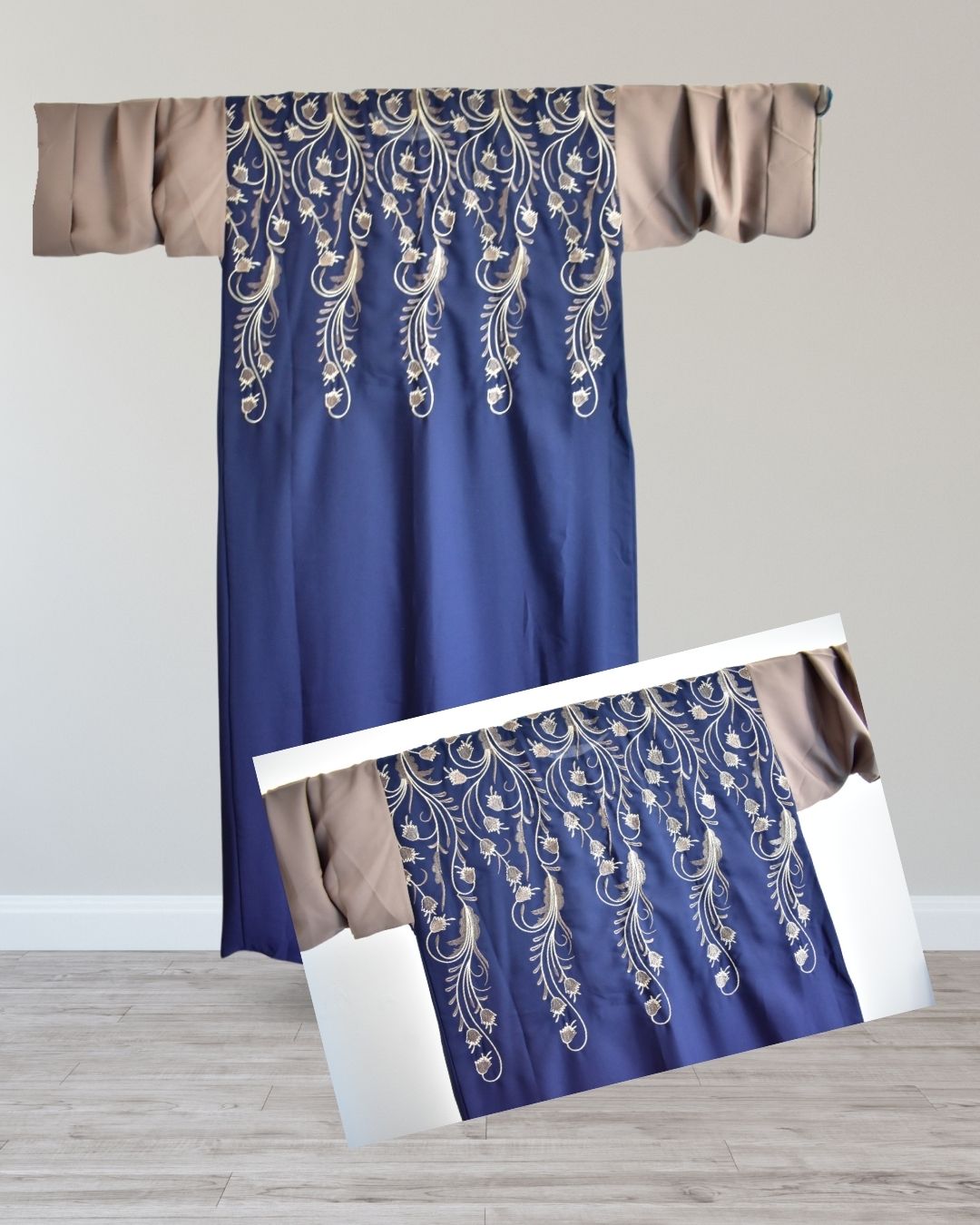ABIM504 3pc Embroidered Contrast Abaya Set Nida Fabric Navy Blue & Brown Open Jacket, Inner & Scarf, Dual-Tone Modest Wear