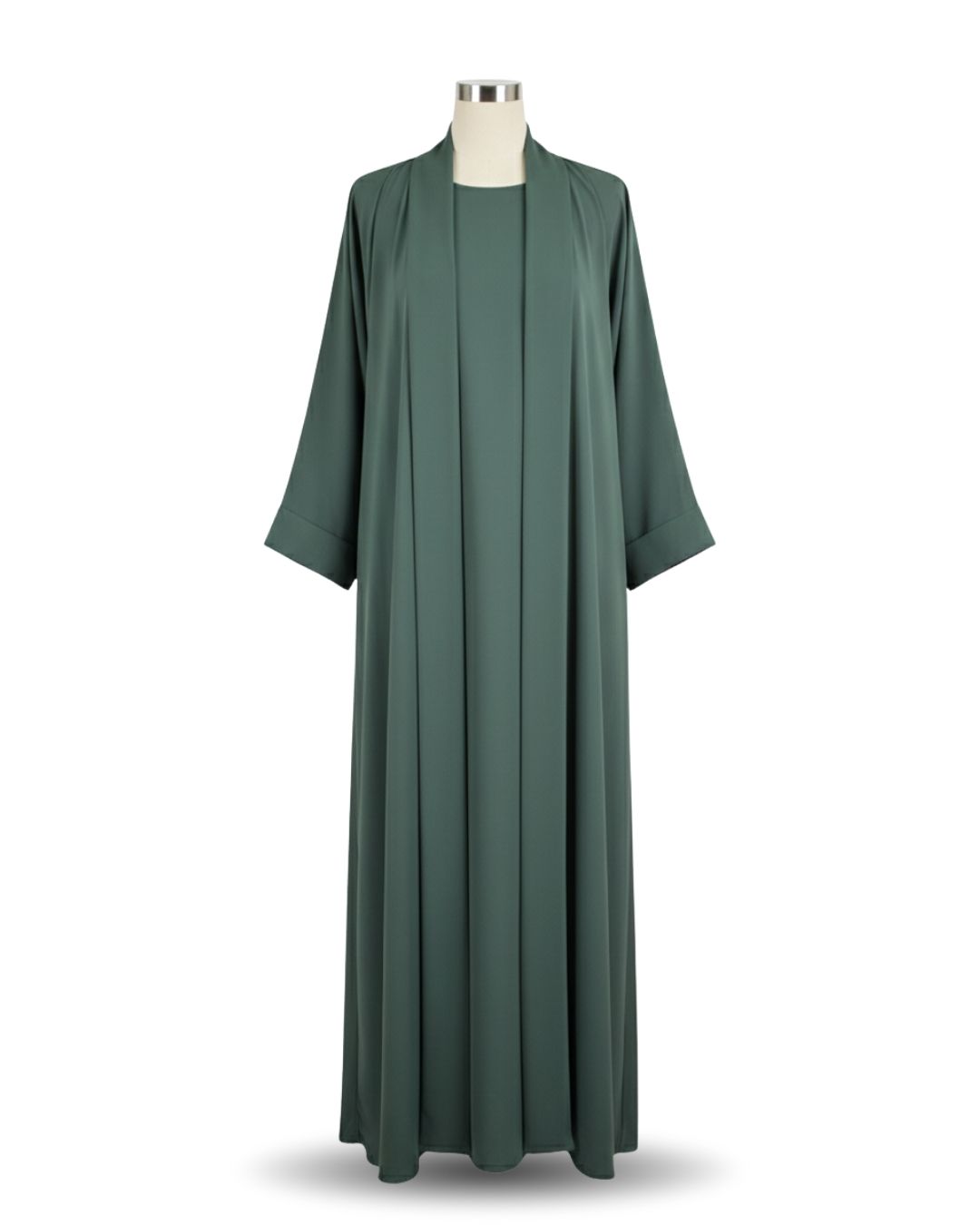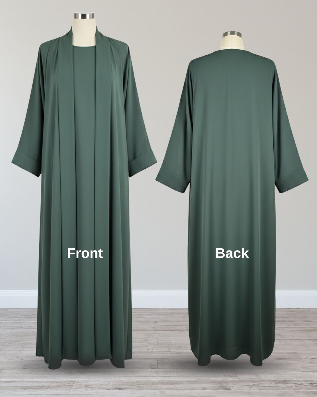 Outer Piece (Jacket): A sophisticated Front Open Long Sleeve Jacket style Abaya, designed to be worn over the inner dress. It features wide sleeves for a relaxed fit and a flattering, fluid drape.