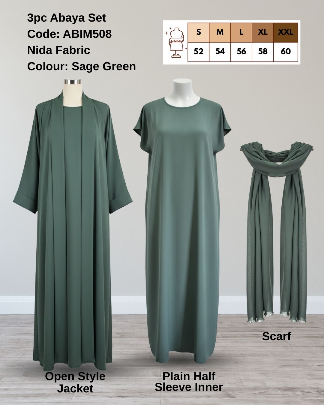 3pc Nida Fabric Abaya Set Open Jacket, Inner Dress & Scarf