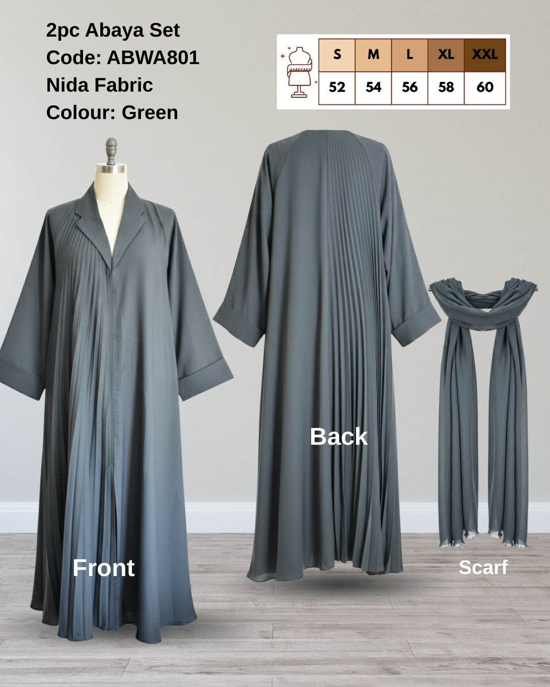 2pc Nida Fabric Pleated Abaya Set Modest Long Dress with Scarf | Designer Open Front Ladies Abaya