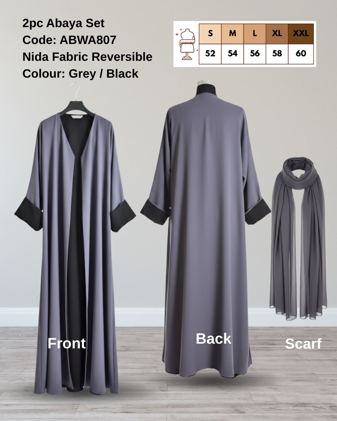 ABWA805 2pc Reversible Abaya Set, Nida Fabric Double Sided, Open Abaya and Scarf