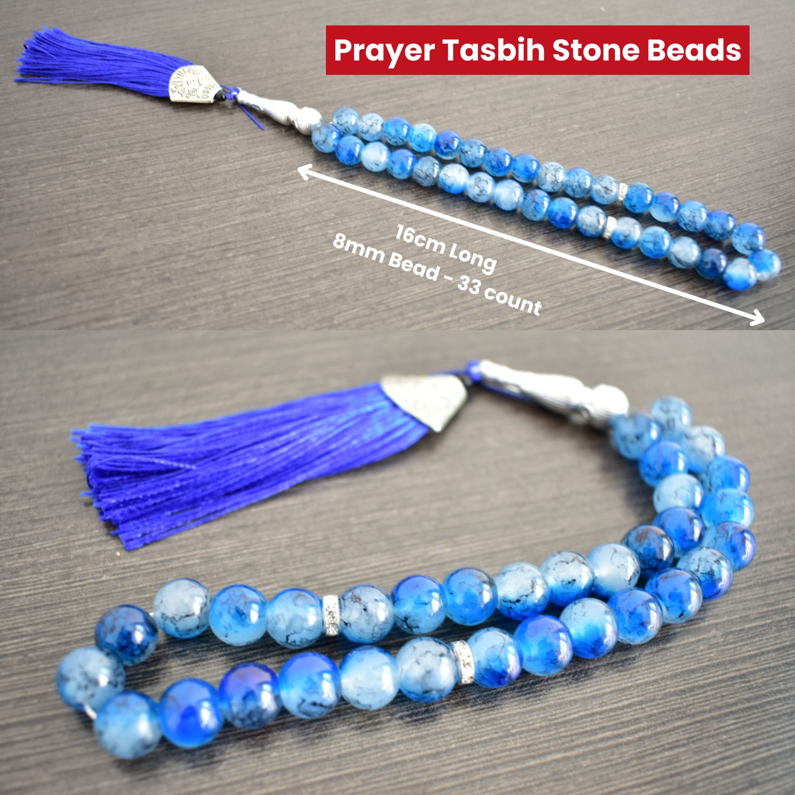 Measuring 16cm in length, the tasbih includes a refined silver-tone accent and a decorative tassel, bringing a touch of sophistication to its traditional design. Ideal for daily prayers, meditation, and Islamic recitation, the beads glide effortlessly through the fingers, making your spiritual practice more focused and serene.