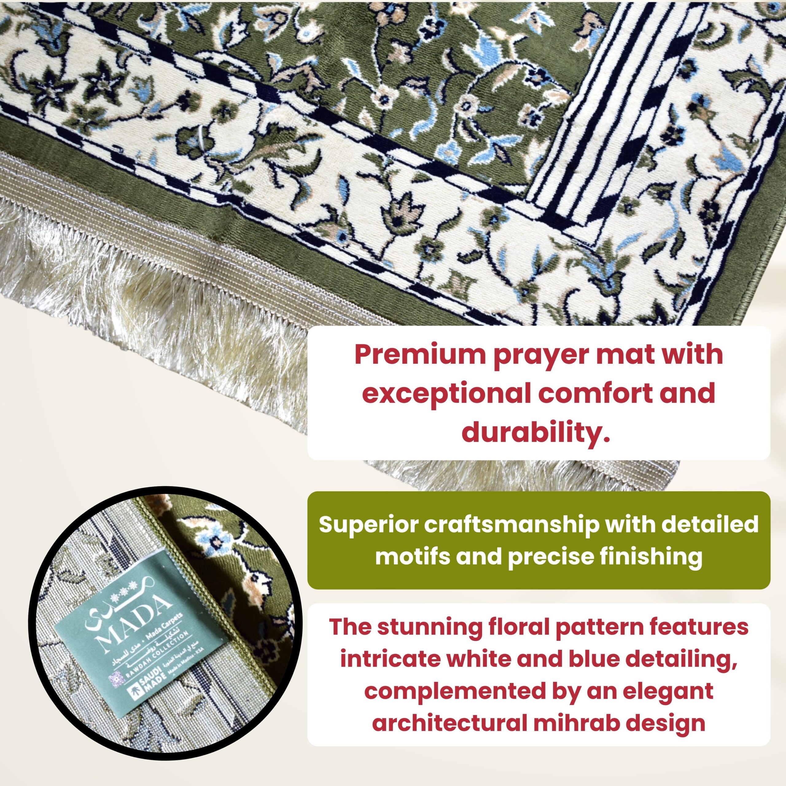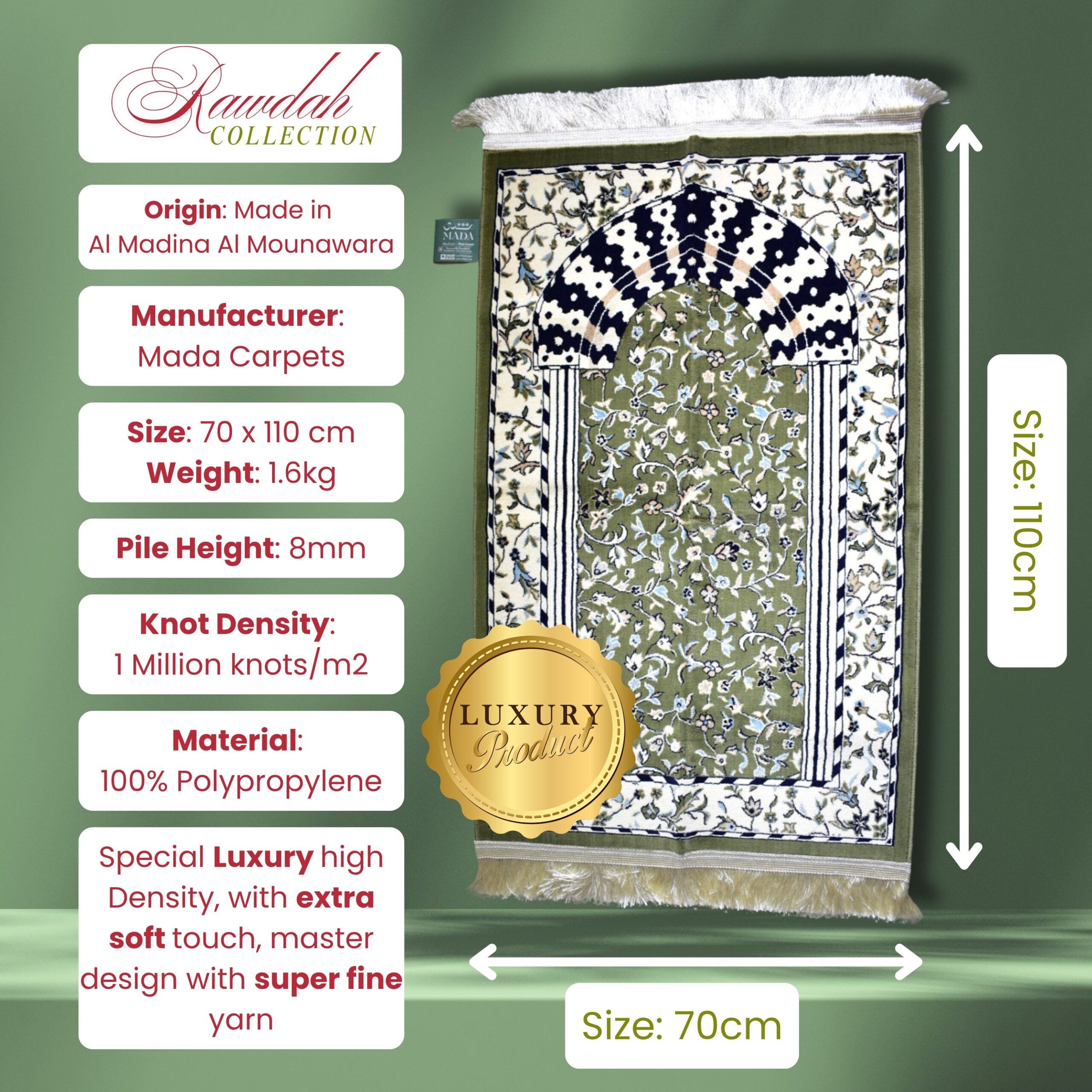 • Green 8mm High Pile 70x110cm Luxury Rawdah Collection RWD805 Islamic Prayer Mat Made in Madinah KSA