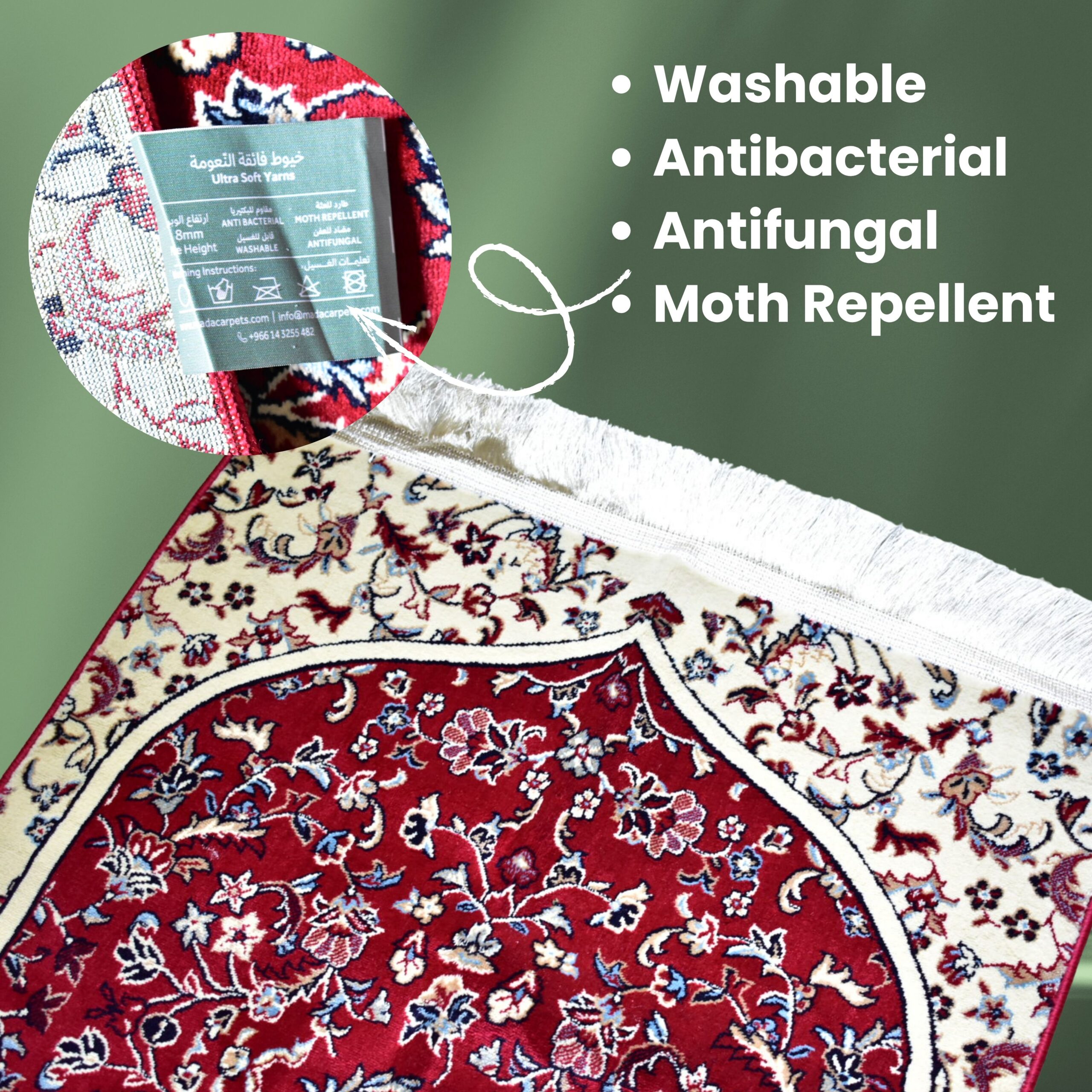 Sized at 70 × 110 cm, it fits perfectly as a personal prayer mat. The material is thoughtfully engineered to be washable, antibacterial, antifungal, and resistant to moth damage, ensuring a clean and practical prayer experience all year round.