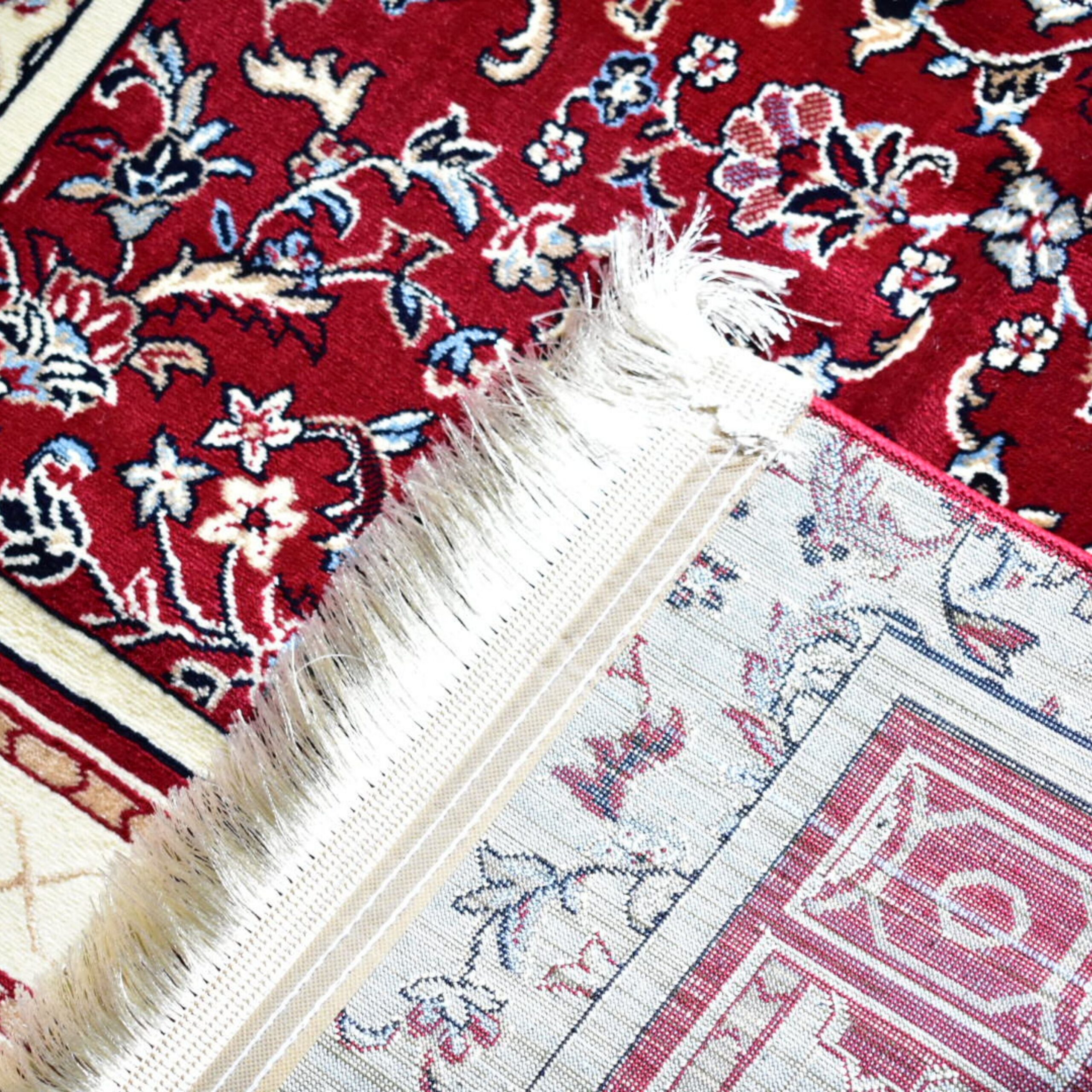 Made using premium heat-set yarn blended with durable polypropylene, the rug has a smooth, soft feel while maintaining long-lasting strength. Its 4 mm pile provides a comfortable cushion during sujood, making it ideal for daily prayers. With a remarkable knot density of around 1 million knots per square meter, every detail in the floral arabesques and arched mihrab motif is rendered with clarity and precision.